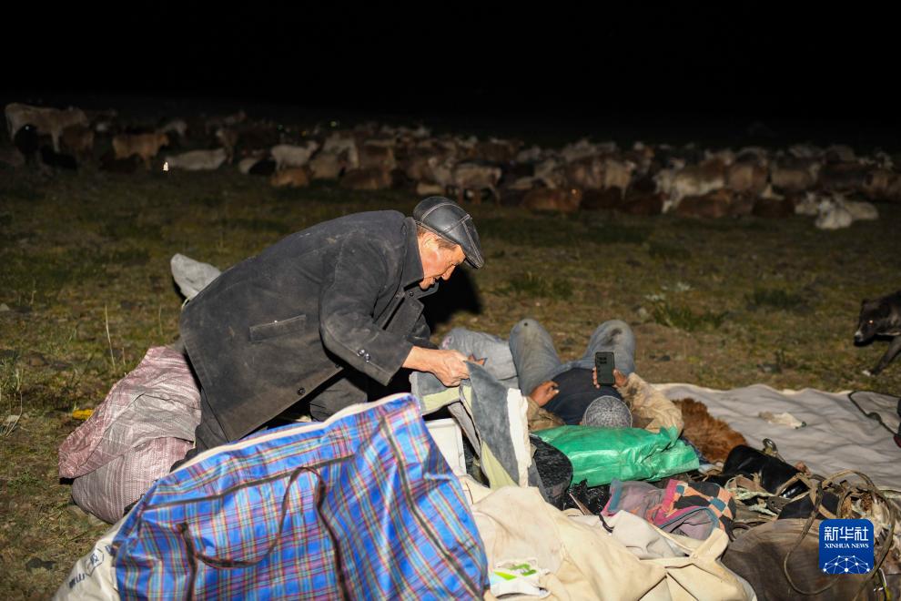 夜色降临,羊群安静下来,哈布得拉什么(左)在睡前检查物品有无丢失(7月3日摄)。转场路途艰辛,牧民早已习惯露宿原野。