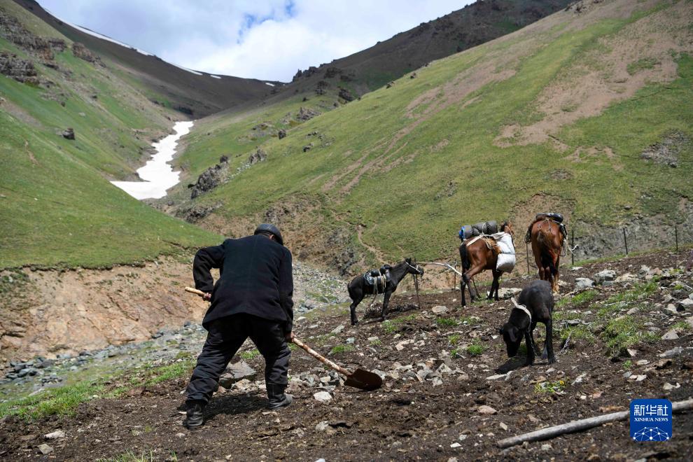 到达夏牧场后,哈布得拉什么在清理羊圈(7月3日摄)。
