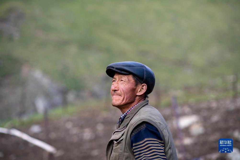 安顿好夏牧场的住宿后,哈布得拉什么望向天空,观察天气情况(7月4日摄)。夏牧场较春牧场海拔上升了约1000米,雨水丰沛,天气变化莫测。