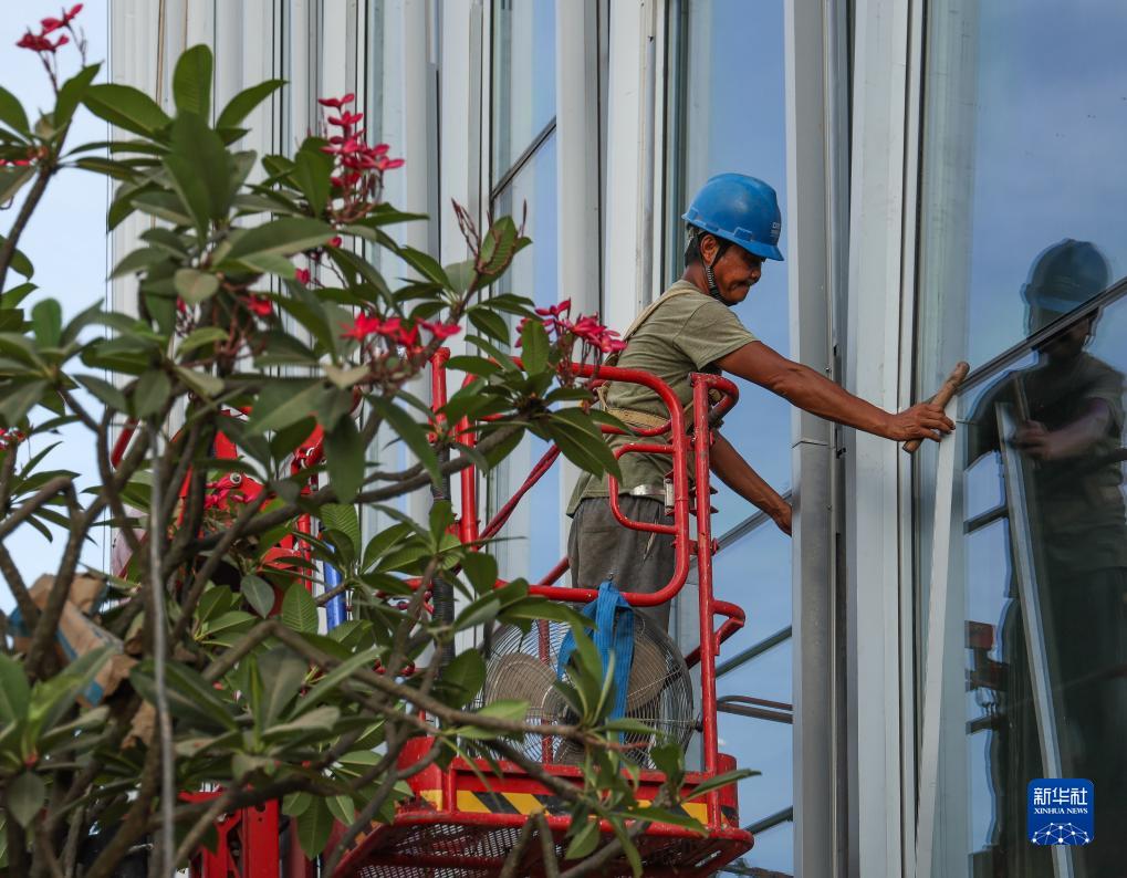 建设者在国际金融论坛(IFF)永久会址进行幕墙施工(7月10日摄)。