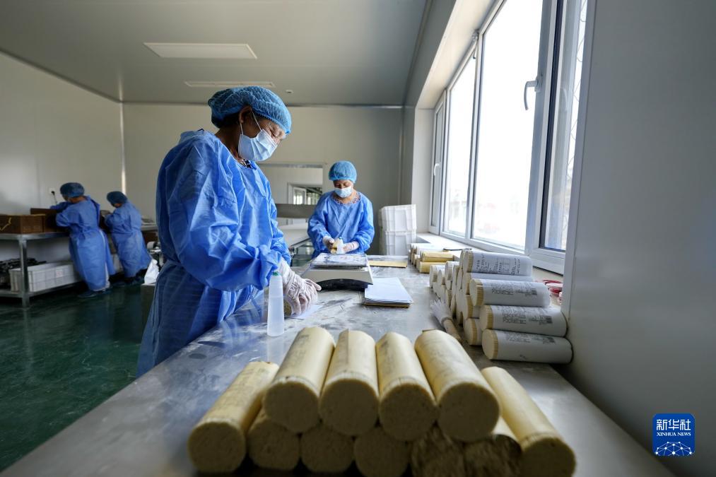 7月11日,河北省迁安市野鸡坨镇丁庄子村一家食品生产企业的工人在包装空心挂面。