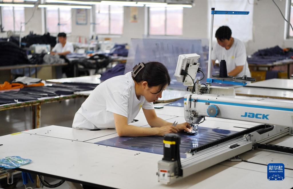 7月11日,河北省迁安市上射雁庄镇七里坎村一家服装加工企业的工人在车间内工作。