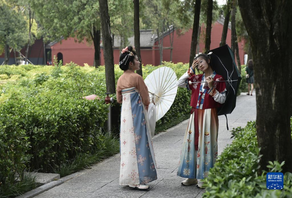 7月11日,身穿古装的游人在洛阳市白马寺景区游览。