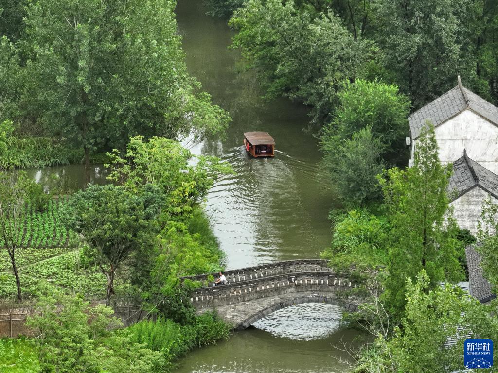 7月11日,游人乘船游览穆沟古村(无人机照片)。