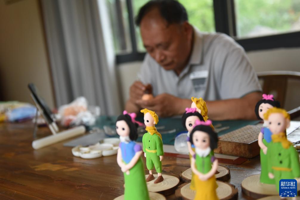 7月11日,江苏省级非物质文化遗产“阜宁面塑”传承人周必良在穆沟古村进行创作。