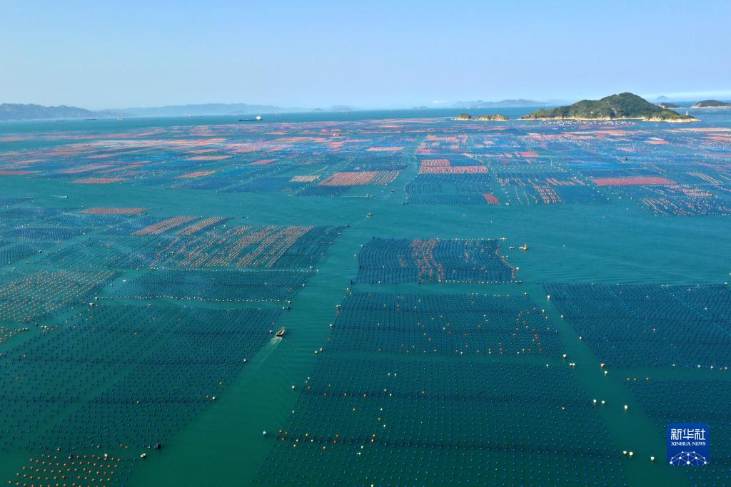 7月11日,在连江县下宫镇松芦湾海域,渔民驾驶渔船穿梭在海上牧场(无人机照片)。