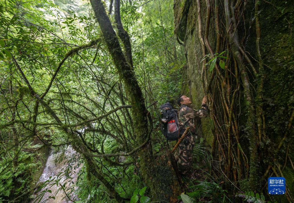 7月8日,在高黎贡山国家级自然保护区,何贵品准备攀爬悬崖。新华社记者 费茂华 摄