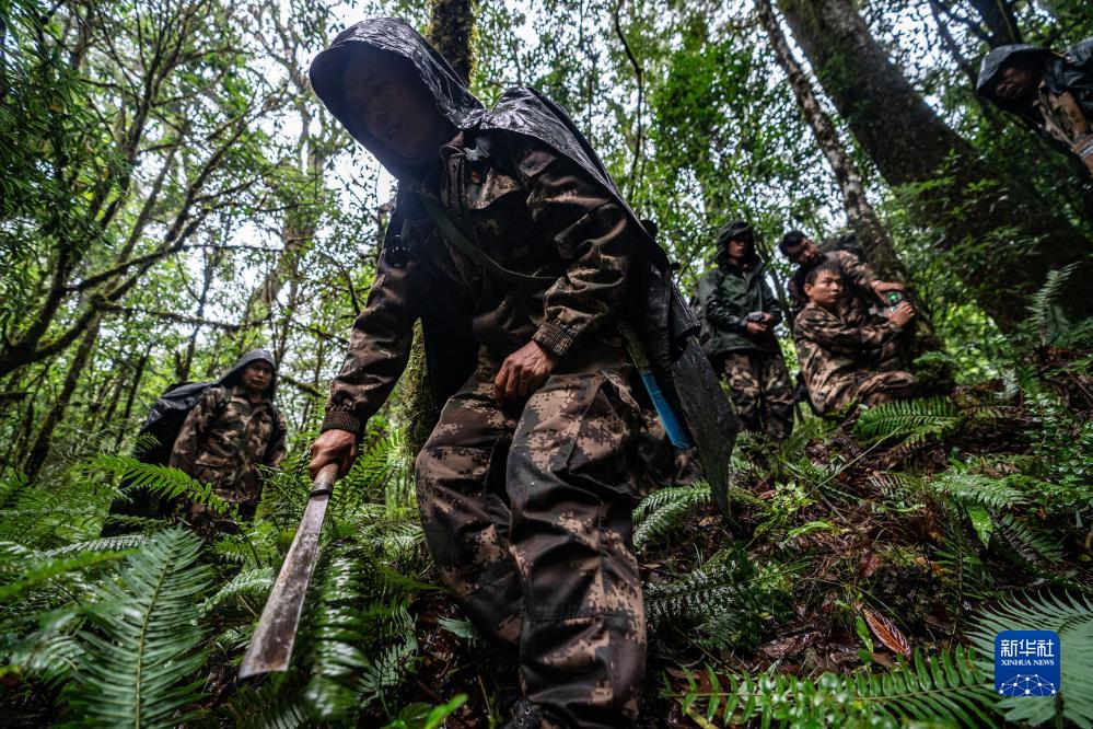 7月9日,在高黎贡山国家级自然保护区,巡护队员清理红外相机附近的杂草。新华社记者 江文耀 摄