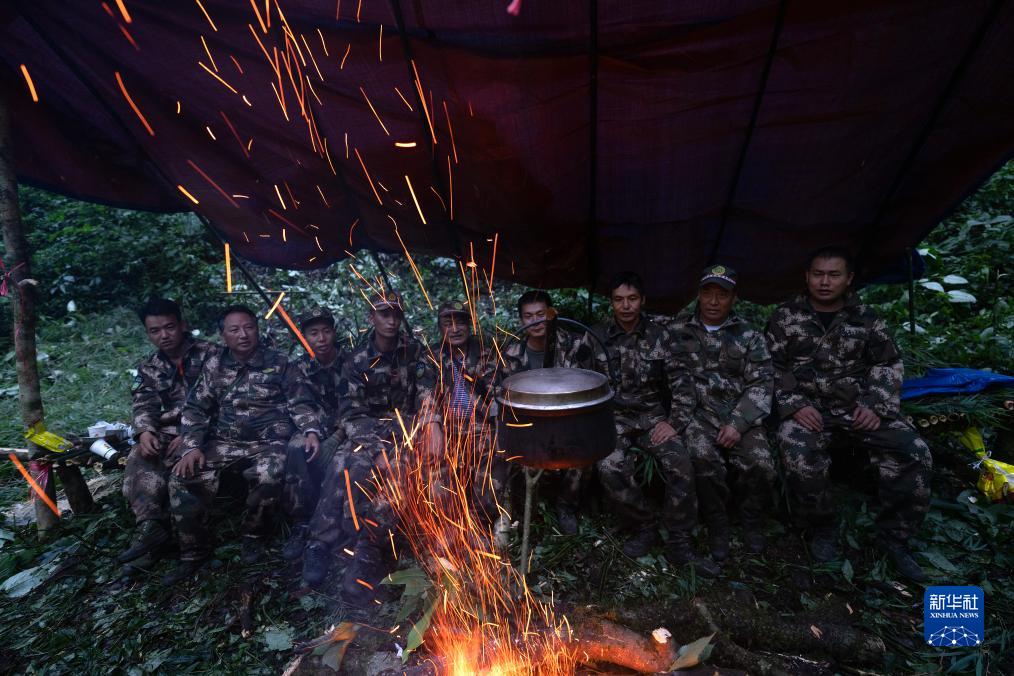 7月8日,在高黎贡山国家自然保护区,巡护队员李加华、何贵品、勒利付、阿华利、张全、周国伟、普三材、欧学军、施建雄(从左至右)坐在篝火旁合影。新华社记者 费茂华 摄