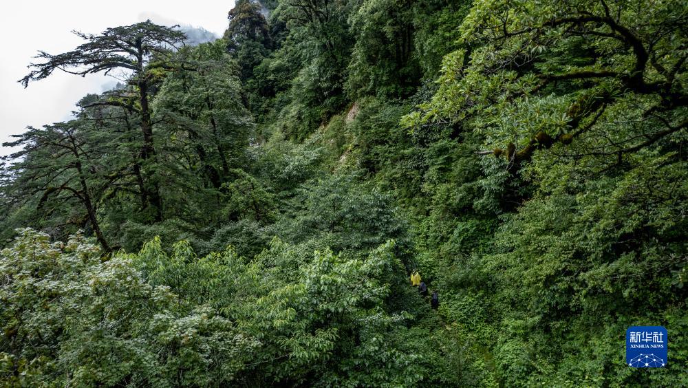 巡护队员在高黎贡山国家级自然保护区巡护(无人机照片,7月9日摄)。新华社记者 江文耀 摄