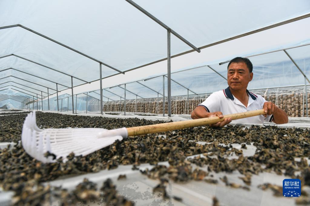7月11日,在内蒙古扎兰屯市扎兰屯黑木耳产业孵化园区内,工作人员在晾晒黑木耳。