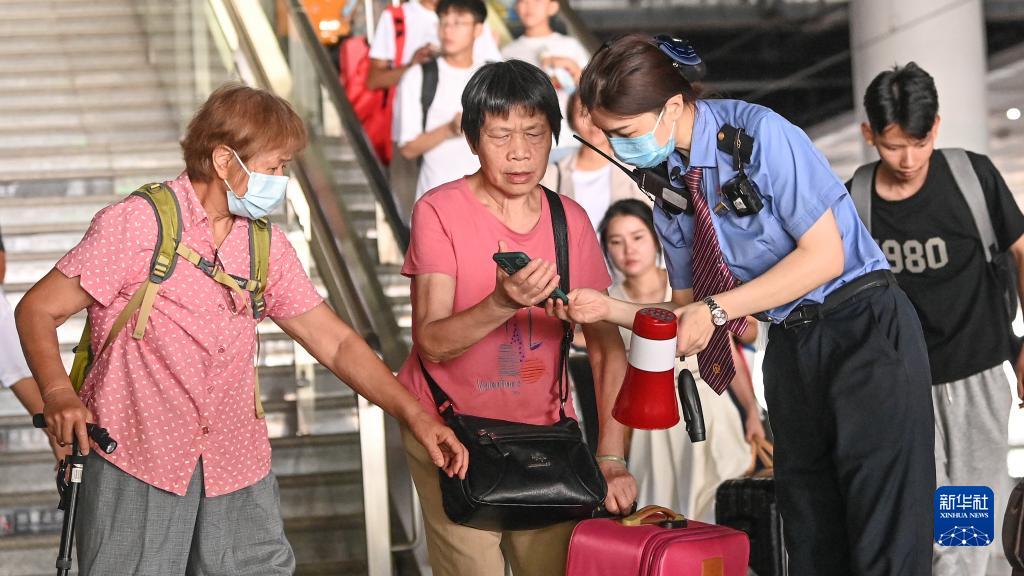 暑运期间,铁路客流量大,运输繁忙。中国铁路南宁局集团有限公司南宁东站的客运员们,每天在各站台密集接发车,护送旅客安全出行。