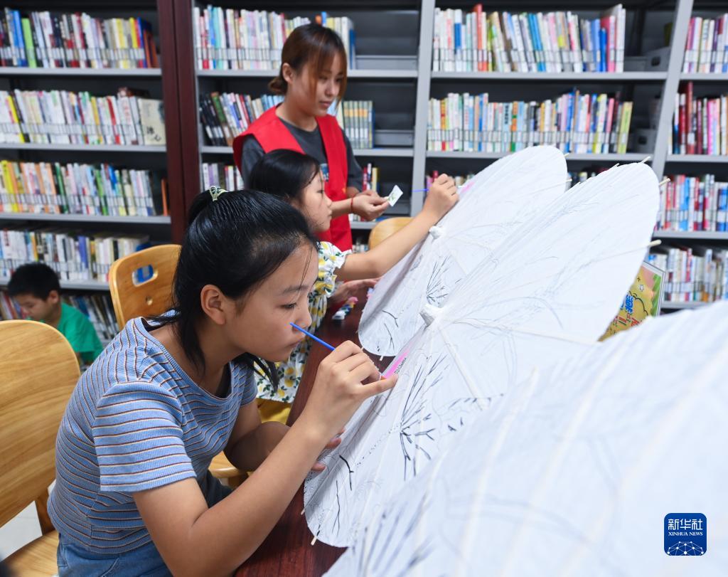 7月12日,在当日开班的乌桥村暑期夏令营里,孩子们在志愿者的指导下在纸伞上绘画。为解决外来务工人员子女暑期“看护难”问题,嘉兴市南湖区新丰镇社工站联合乌桥村开展“候鸟归巢,欢乐一‘夏’”暑期夏令营,外地来此过暑假的小候鸟们可以在这里学习科普知识,接受暑期安全教育,参加绘画、手工兴趣课等。