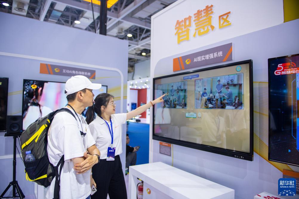 7月12日,参展商(右)在中国新媒体技术展上向参观者介绍AI现实增强系统。