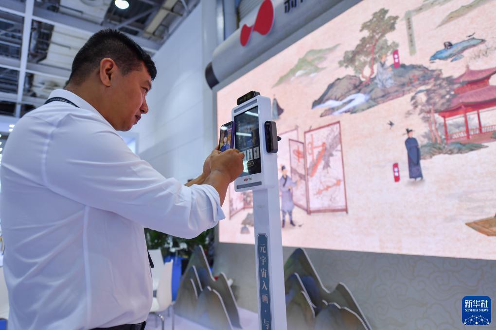 7月12日,参观者在中国新媒体技术展上体验文化数字化操作系统。