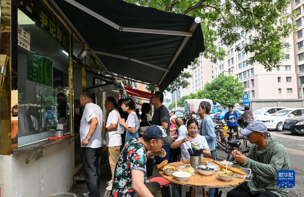 7月11日,人们在天津西北角西关北街的一家早点铺吃早点。