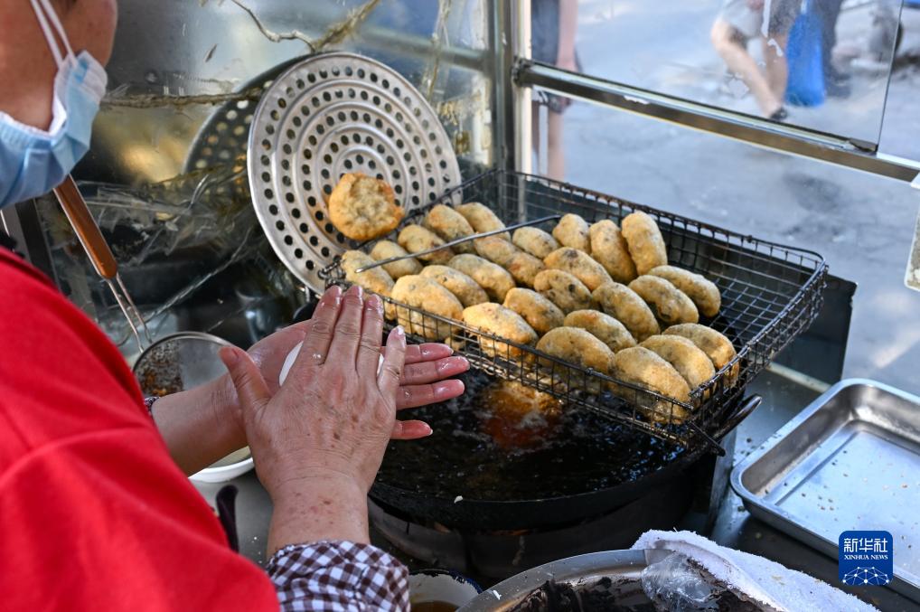 7月10日,在天津市红桥区西关大街一家早点铺,商家在制作炸糕。