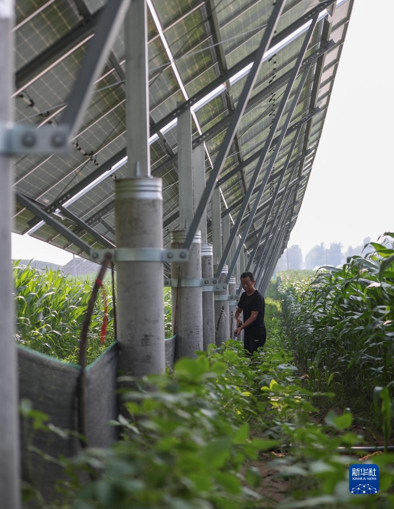 7月11日,在辽宁省彰武县冯家镇哈大冷村,村民为太阳能光伏电板下方的作物除草。