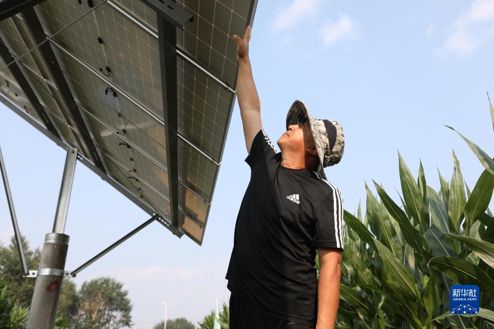 7月11日,在辽宁省彰武县冯家镇哈大冷村,冯家镇政府工作人员在检查太阳能光伏发电设备。