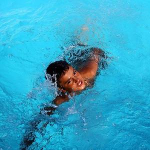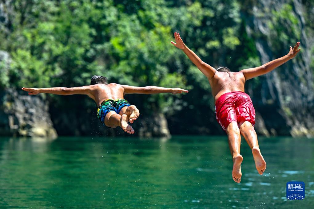 7月12日,在北马其顿斯科普里附近的特雷斯卡河,人们跳水纳凉。