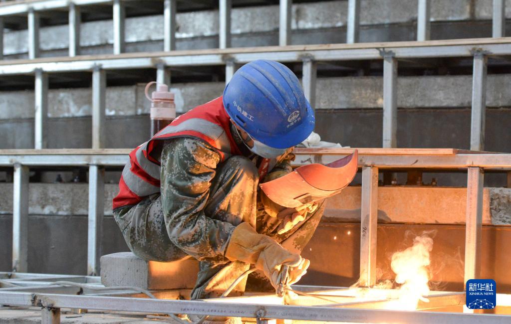 7月13日,工人在北京城市副中心图书馆项目施工现场施工。