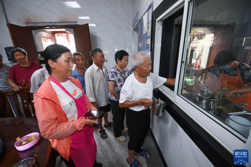 7月13日,老人们在湍口镇迎丰村老年食堂打饭。这个老年食堂的建设得益于新乡贤们的捐赠相助。