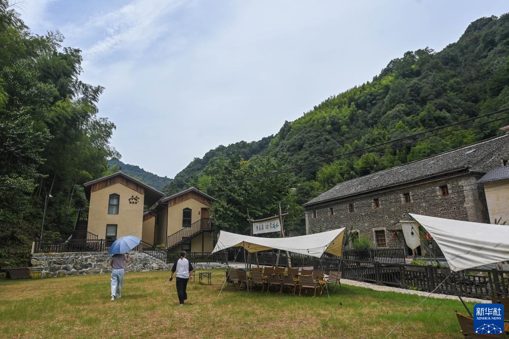 7月13日拍摄的湍口镇湍源里民宿集群。这个由闲置粮仓和村民旧居改造而成的民宿由当地新乡贤出资打造并经营,为村集体增加租金收入300万元,带动100余人次就业。