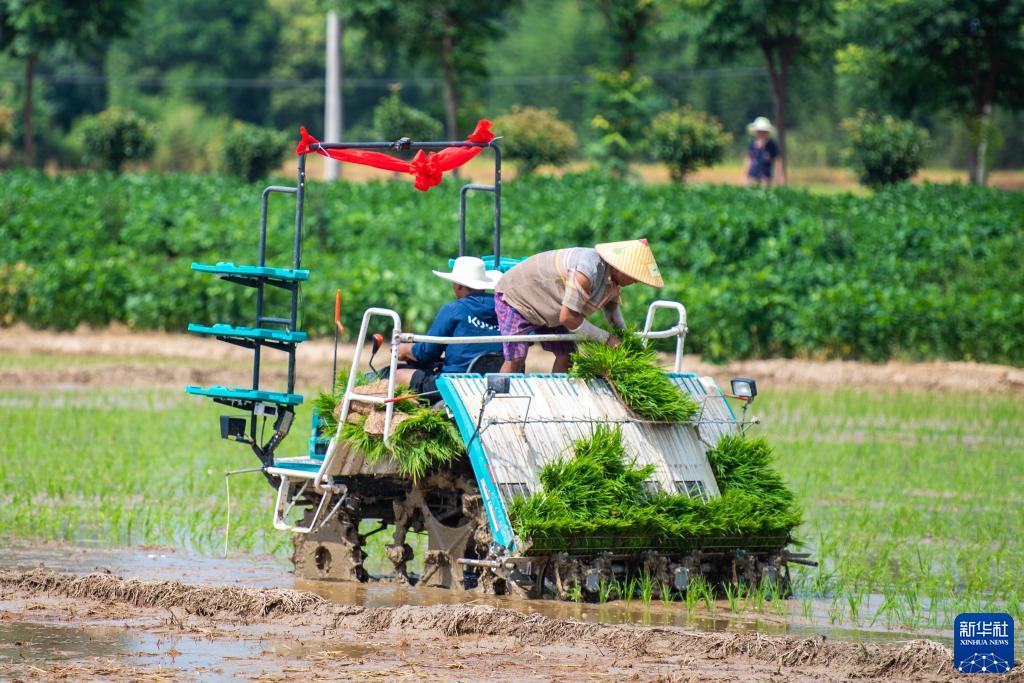 7月13日,在岩汪湖镇武竺山村,农民驾驶插秧机进行水稻插秧作业。