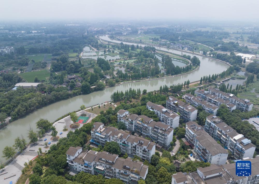 俯瞰成都市郫都区三道堰徐堰河畔的空中绿道和居民小区,徐堰河是锦江主要支流之一(6月23日摄,无人机照片)。新华社记者 江宏景摄