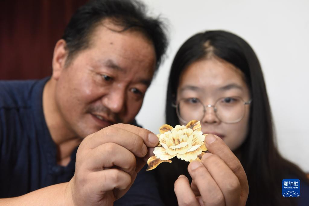 7月12日,吴永龙向学生展示麦秆画的拼接方法。新华社记者 黄晓勇 摄