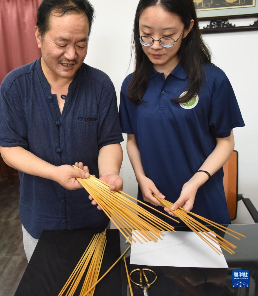 7月12日,吴永龙向学生教授选择粗壮、圆挺、笔直、色匀的麦秆。新华社记者 黄晓勇 摄