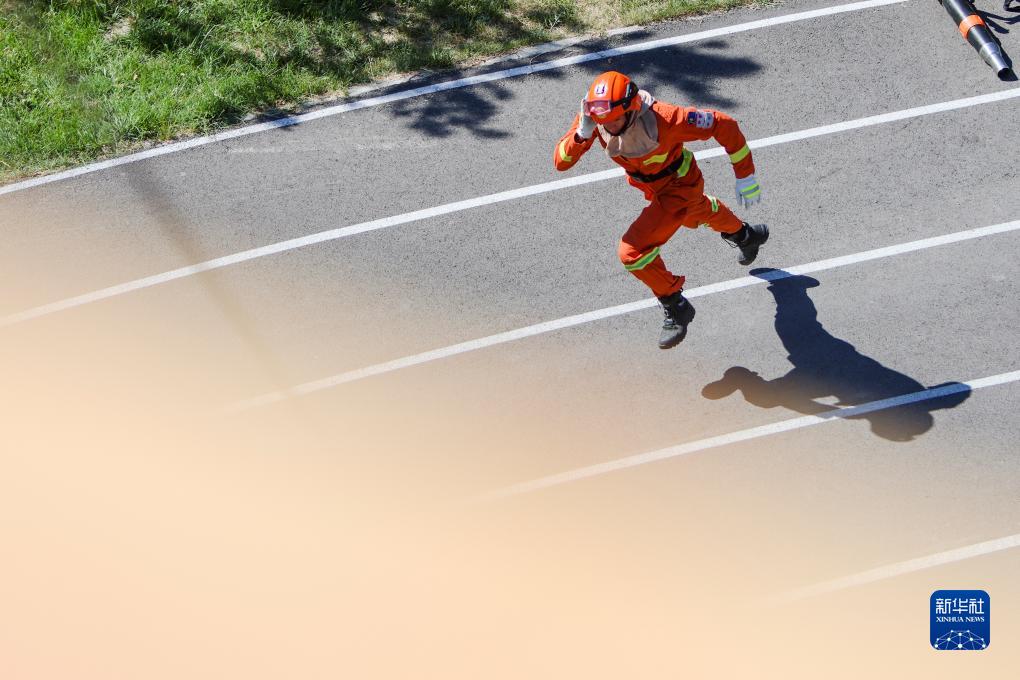 7月13日,一名消防员在专业技能大比武中向下一个目标点冲刺。