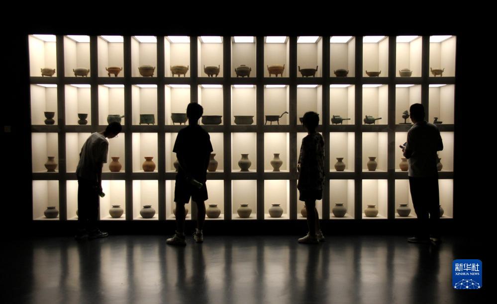 7月13日,在山东省滕州市博物馆,几名学生(左一至三)在观看出土的文物。