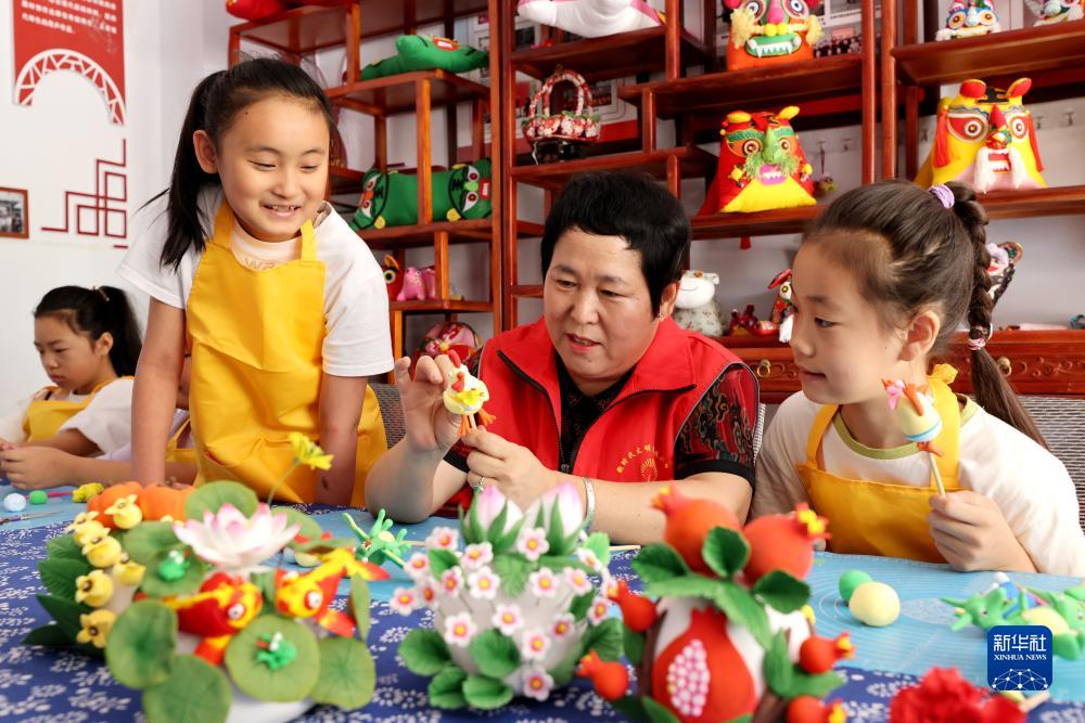 7月13日,孩子们在山东省枣庄市龙山路街道民间艺术志愿者工作室学习面塑制作技艺。