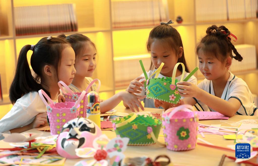 7月13日,四川省仁寿县的孩子们在暑托班制作花篮。