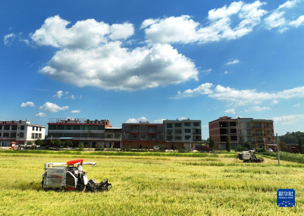 7月12日,在衡阳市祁东县金桥镇,农机手驾驶收割机在收割早稻(无人机照片)。