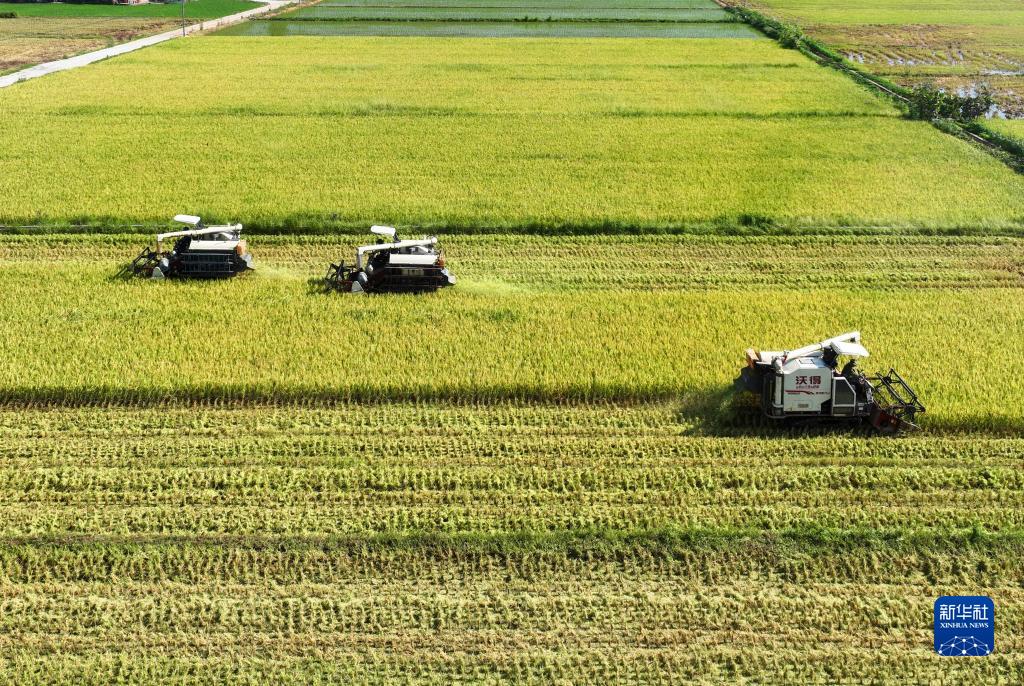 7月12日,在衡阳市祁东县金桥镇,农机手驾驶收割机在收割早稻(无人机照片)。