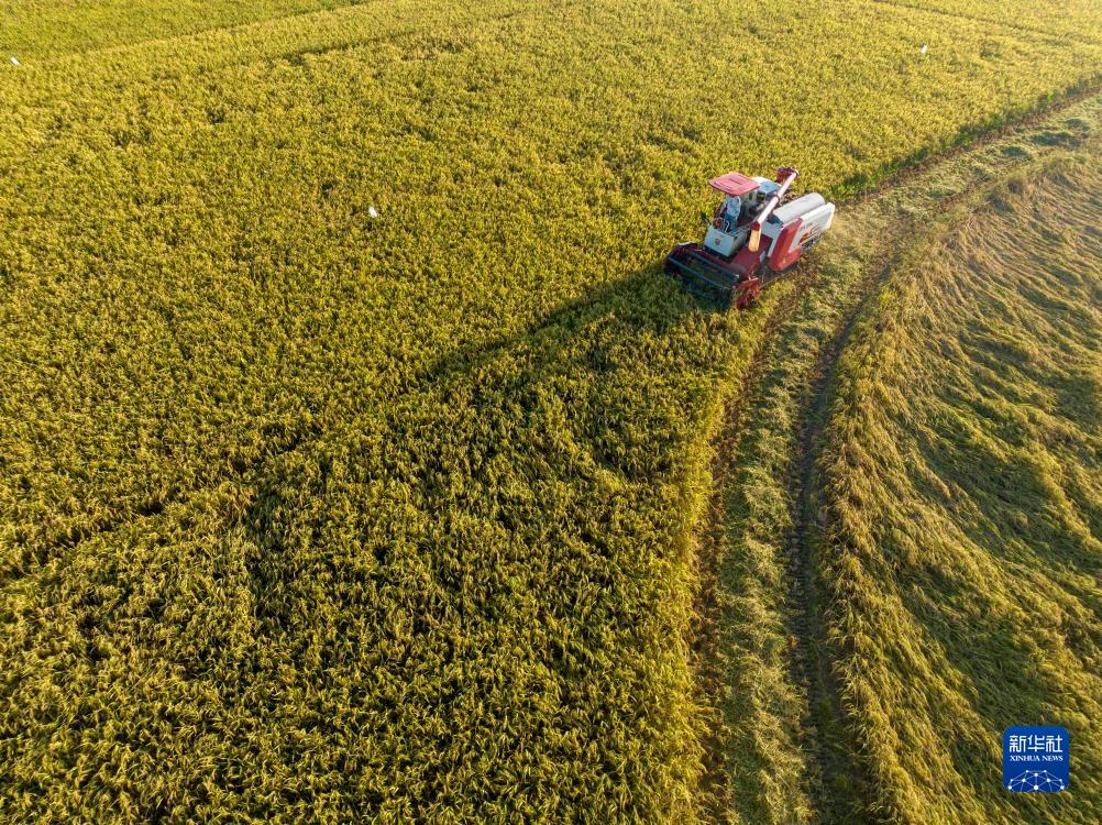 7月12日,在永州市道县蚣坝镇光家岭村,农民驾驶机械收割早稻(无人机照片)。