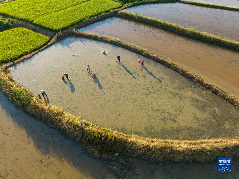 7月12日,在永州市道县蚣坝镇光家岭村,农民在抛种晚稻(无人机照片)。