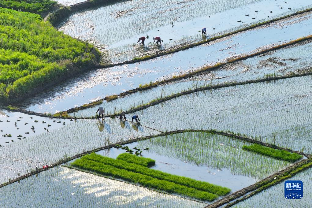 7月11日,在衡阳市衡东县吴集镇杨梓坪村,村民在插晚稻(无人机照片)。