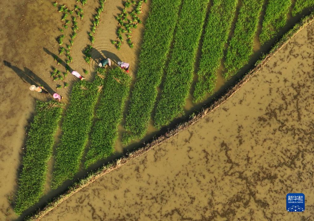 7月13日,在衡阳市衡东县霞流镇,当地村民在起秧苗(无人机照片)。
