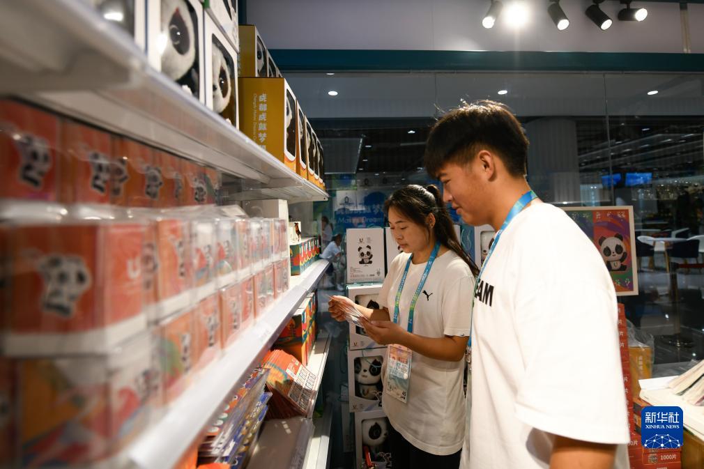 7月14日,媒体工作人员在成都大运会主媒体中心大运会官方特许商品零售店内选购纪念品。
