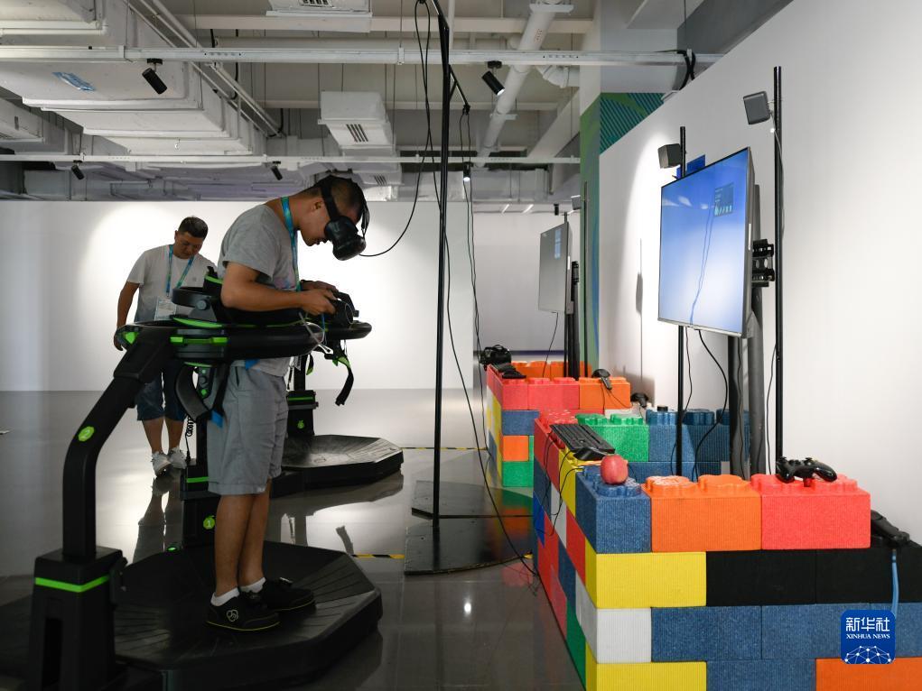 7月14日,媒体工作人员在成都大运会主媒体中心休闲娱乐区内体验VR游戏。