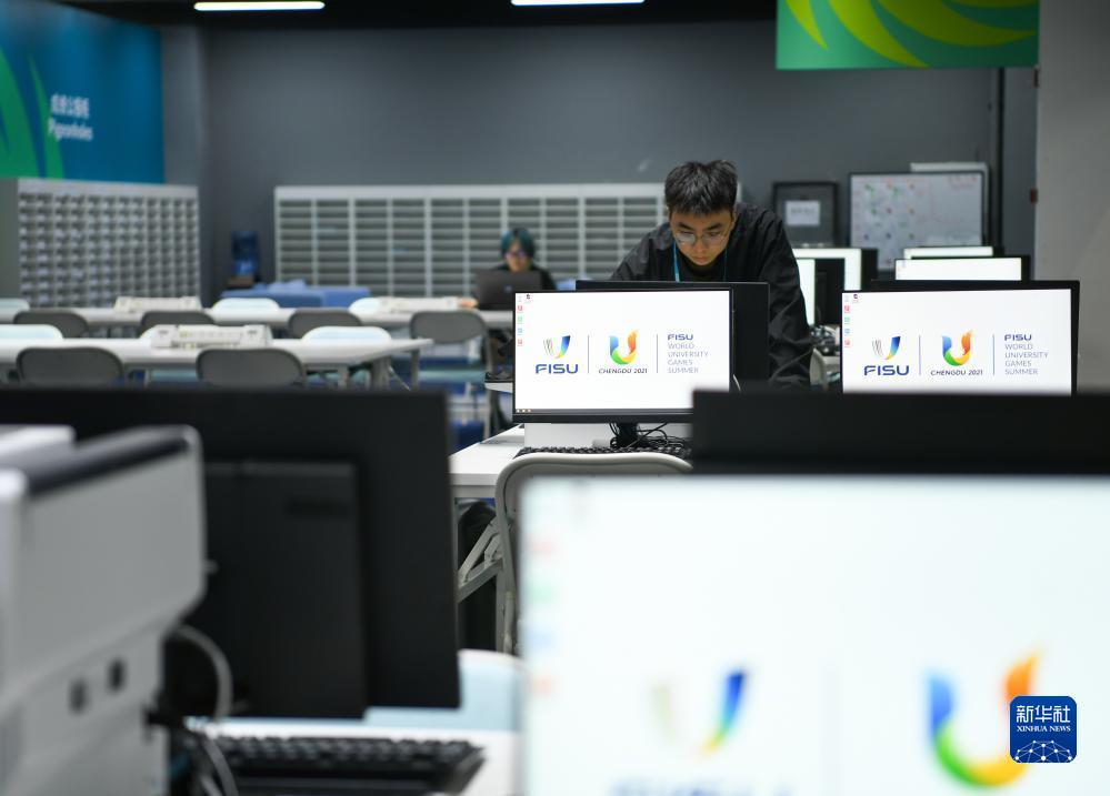7月13日,在成都大运会主媒体中心,工作人员正在调试媒体工作间的电脑。