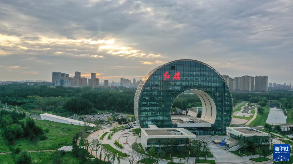 7月13日无人机拍摄的晨曦中的一汽红旗创新大厦。