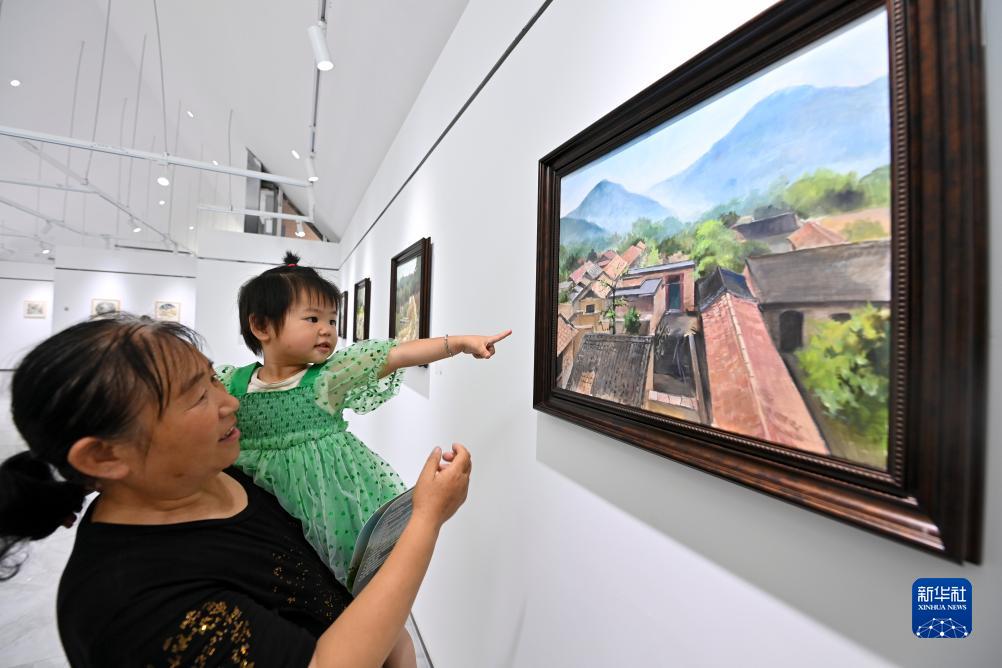 村民在位于左权县泽城村的中国北方国际写生基地艺术市集内参观(7月13日摄)。