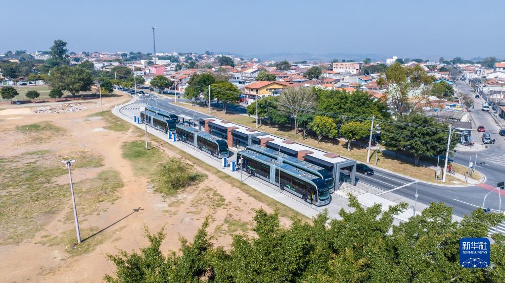 这是7月12日在巴西圣保罗州圣若泽杜斯坎普斯快速公交系统“绿线”始发站拍摄的比亚迪纯电动大巴(无人机照片)。