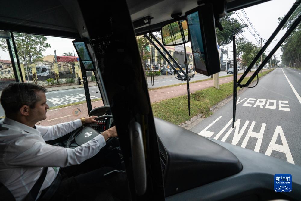 7月12日,在巴西圣保罗州圣若泽杜斯坎普斯,司机驾驶比亚迪纯电动大巴在该市快速公交系统“绿线”上行驶。