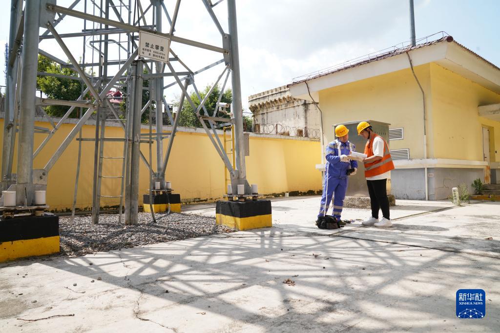 7月11日,在哈齐高铁1号基站,魏巍(左)在上塔前与防护员曹学明确认作业要点。