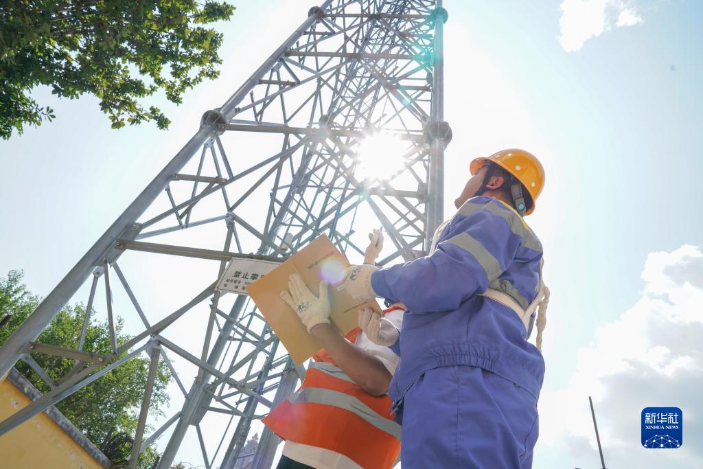 7月11日,在哈齐高铁1号基站,魏巍(右)在上塔前与防护员曹学明确认作业要点。